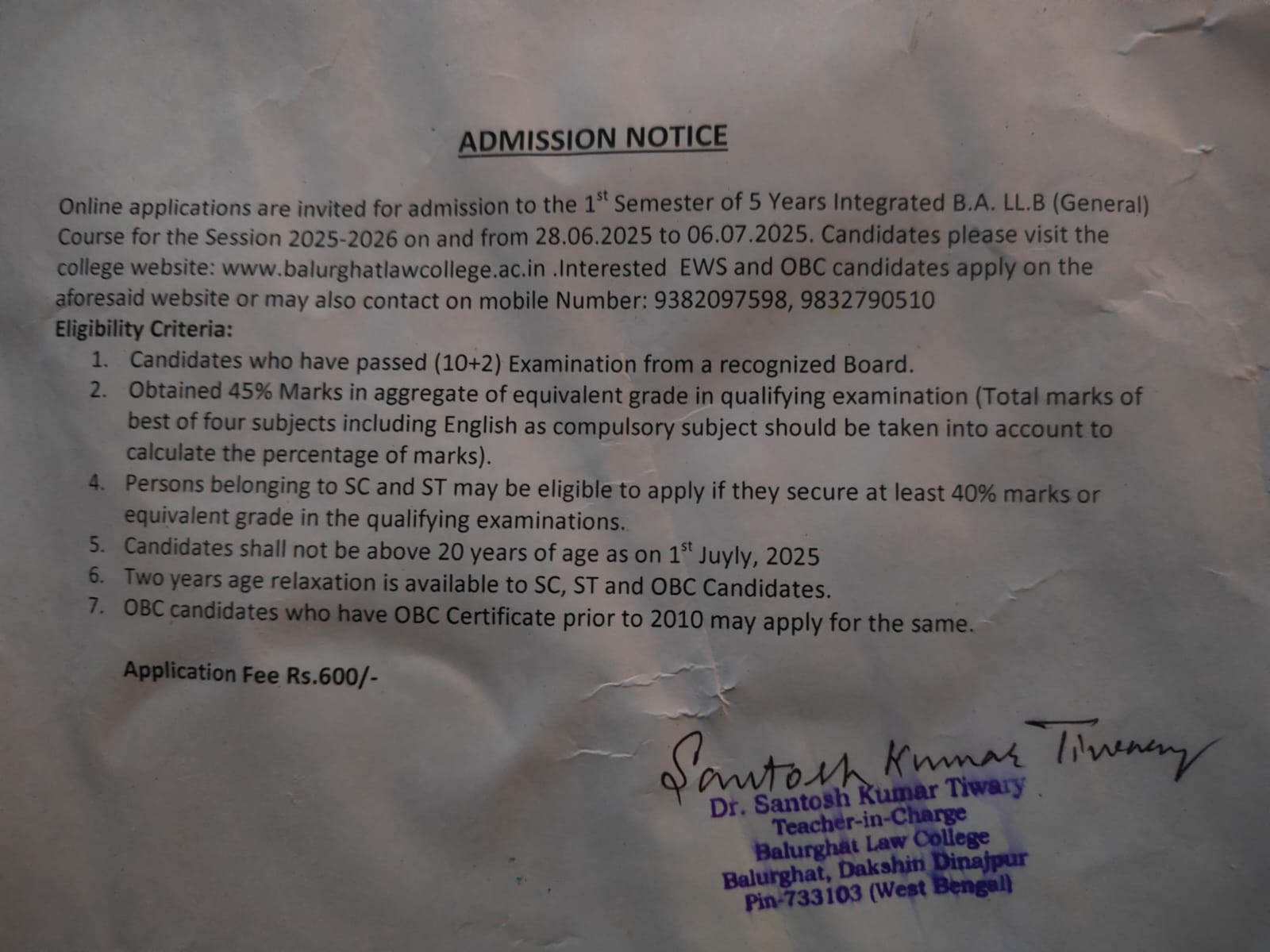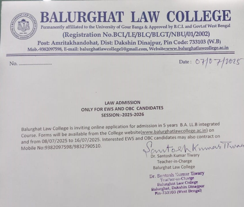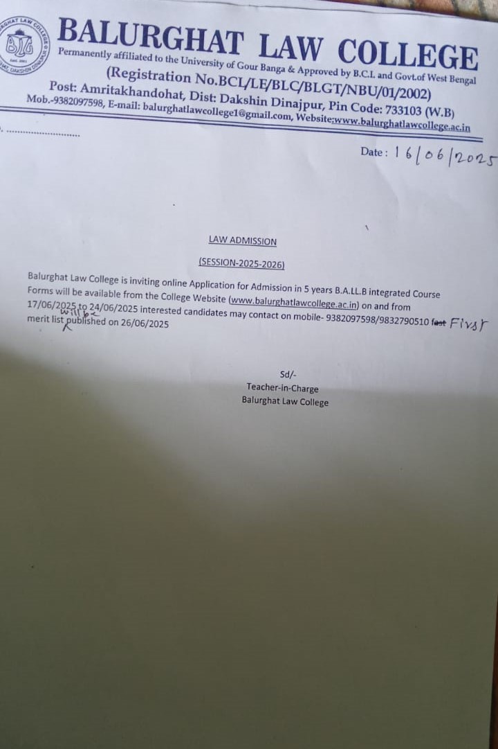 Balurghat Law College (Government Aided), a pioneering Law College was founded on 2001 with the objective of promoting and providing quality legal education is the said region. It is the only Law College in the entire District and its neighbo Read More...
